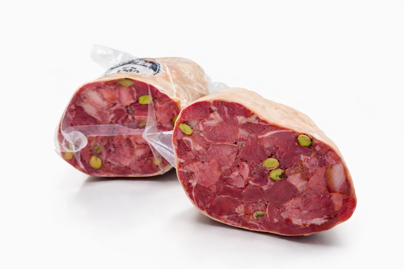 | Ingredients | carn i parts de porc (llengua de porc, tripa natural de porc, galta de porc i careta de porc), brou de carn (aigua, ossos de vedella, àpit, ceba, pastanaga, sal), aigua, festucs, sal i vi blanc. |