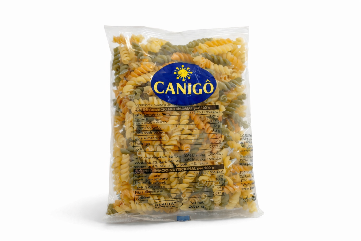 Les espirals tricolor Canigó combinen tres colors naturals que aporten un toc visual atractiu als plats: el color natural de la pasta, el verd d’espinacs i el vermell de tomàquet. La seva forma en espiral és ideal per retenir salses, amanides de pasta o plats freds, ja que la seva estructura permet que els ingredients i condiments s’hi adhereixin perfectament. Són una opció molt versàtil tant per a plats de pasta amb salsa com per a amanides mediterrànies amb verdures, formatge o tonyina.